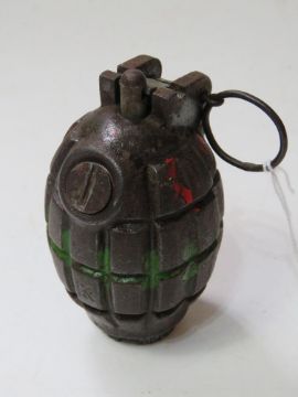 An inert WWII No.36 Mills grenade dated 1944 and marked K to the side and base.