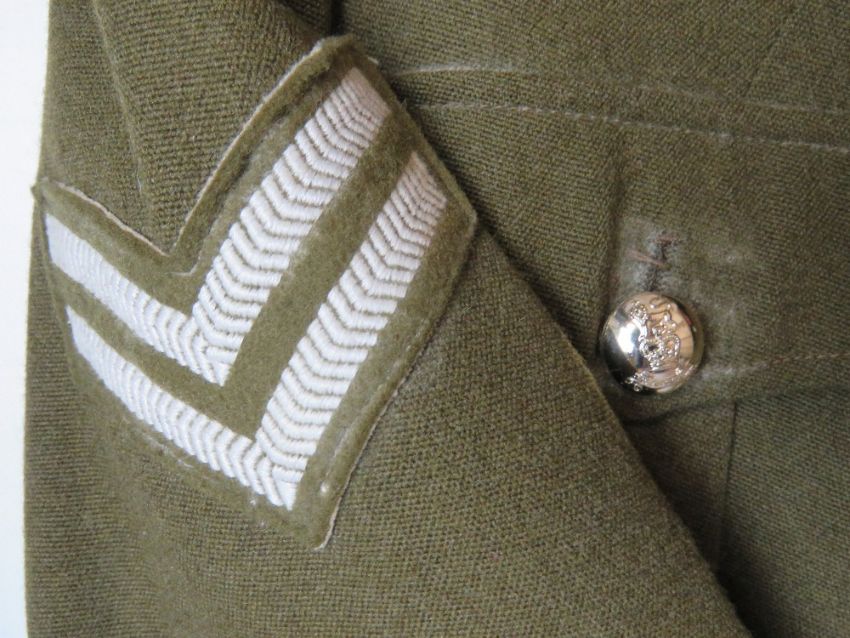 A British Army No 2 dress tunic, size 32, having patches and buttons upon.
