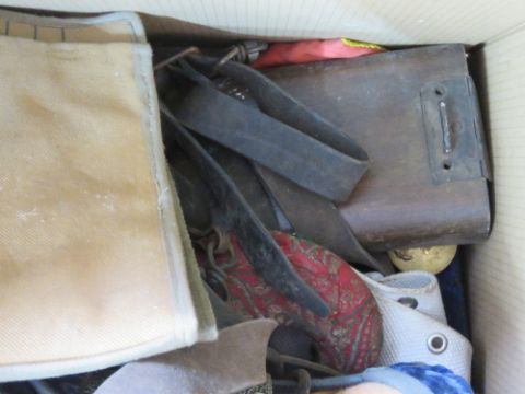 A quantity of assorted militaria inc; Naval belt buckles, dog tags, k98 oil bottle, k98 cleaning kit, c96 wooden stock, leather slings, white belt, cleaning kit pouch, scabbards, no.4 frogs, a boot spur, wooden furniture, kukri knife with scabbard, canvas sling, etc.