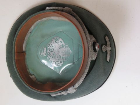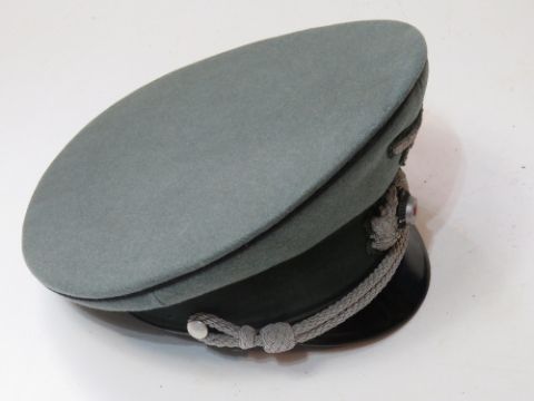 A WWII German Officers Pioneer Visor Cap with the celluloid lozenge still in place. Black piping to the crown and upper and lower sections, with a set of national eagle and swastika in officers bullion wire. One small moth hole noted.