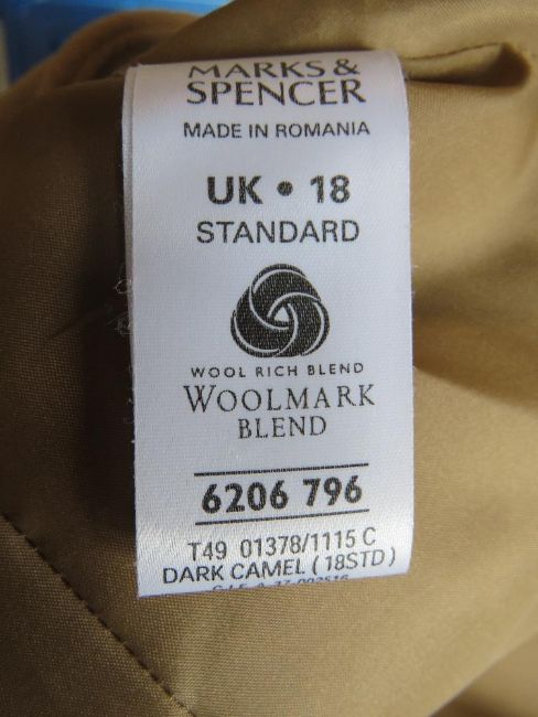 A ladies 80% pure new wool 'dark camel' coloured coat by M&S size 18.