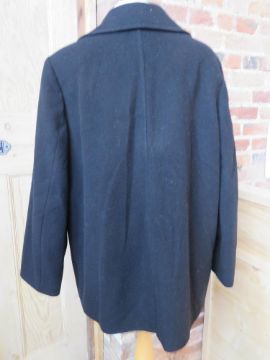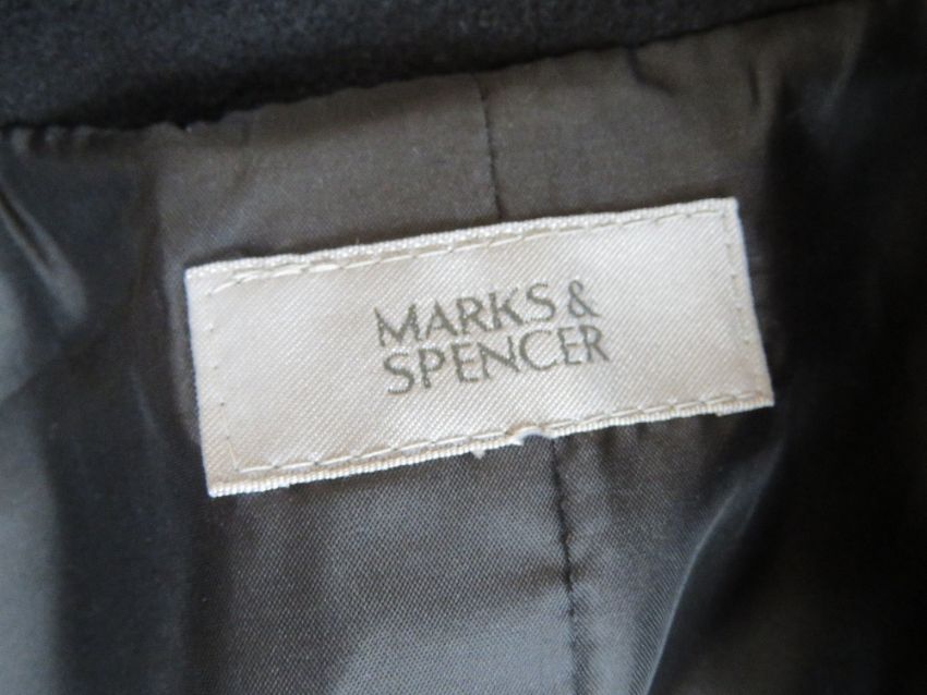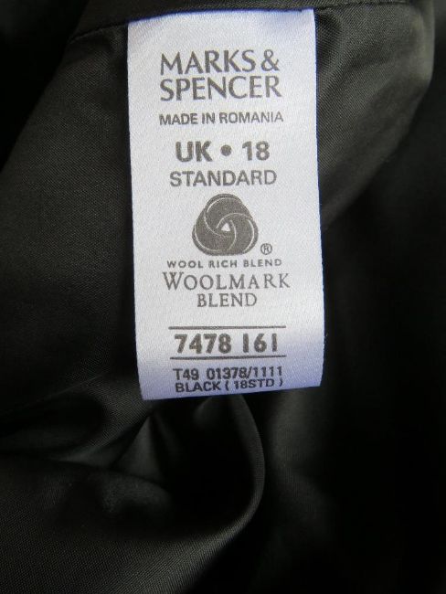 An 80% wool black ladies coat size 18 by Marks and Spencer's.