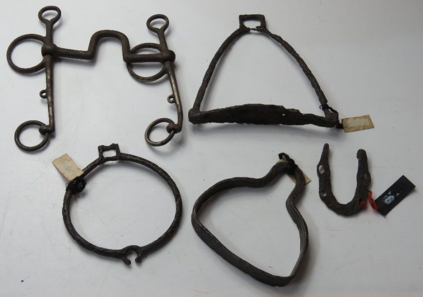 A quantity of assorted militaria inc; stirrups from the 10th, 11th and 12thC, a wavy rim donkey shoe from the 12thC and a horse bit.