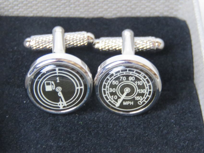 A pair of as new cufflinks in the form of dashboard dials by Onyx-Art in presentation box.