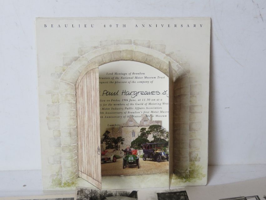 A quantity of assorted motoring themed photographic prints and a Beaulieu 40th Anniversary invitation.
