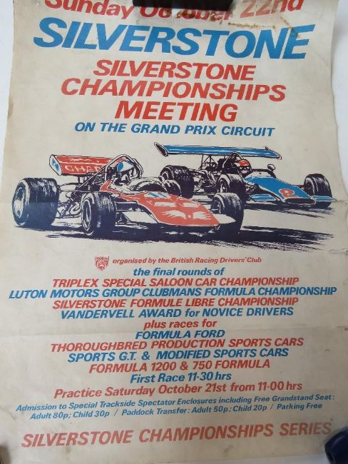 An original Silverstone poster c1970s for the Silverstone Championships Meeting on the Grand Prix Circuit, organised by the British Racing Drvier's Club, designed by Paul Torr in white ground with red and blue text. Measuring 62.5 x 45cm.