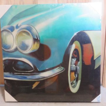A contemporary canvas print of a teal and white 1950s style car measuring 59.5 x 59.5cm.