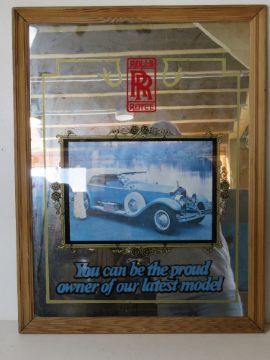 A Rolls Royce advertising mirror in pine frame measuring 50 x 66cm overall.