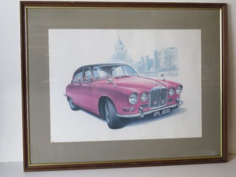 A large framed and mounted print of a Jaguar G Reg 1959 Sovereign, measuring approx 54 x 67cm.