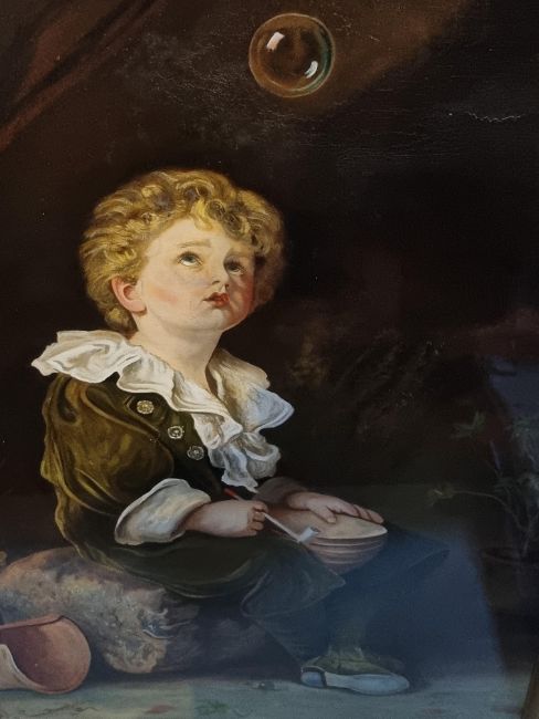 A fine over-painted print from the John Everett Millais painting know as 'Bubbles', a good copy of the original in an unknown hand, slight damage noted to the paper, contained within a heavy recessed wooden composite frame sight size 47.5 x 71cm. Overall size 71 x 94.5cm.