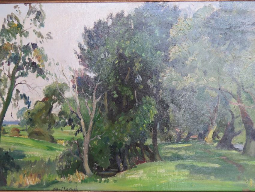 Attributed to GHB Holland (British-Northamptonshire artist 1901-1987) oil on board of a countryside scene signed lower left Holland (partially lost under frame), sight size 54 x 37cm, framed size 69 x 51.5cm.