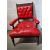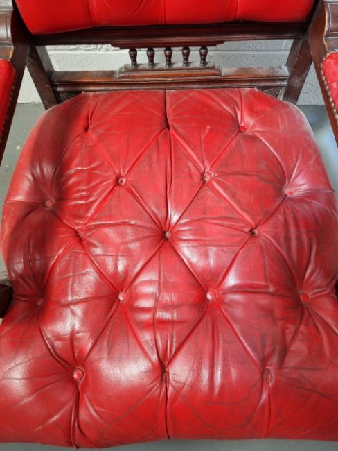 A Victorian Gothic Revival library chair upholstered in red leather and having floral carving to back, raised over turned legs to front, approx 72cm wide, 78cm deep, 101cm high, some seat studs deficient, horse hair stuffing to arms.