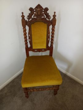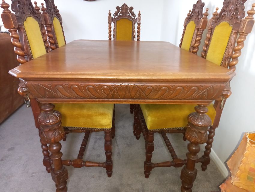 Set of six 19th century Dutch carved oak dining chairs each with crest rail with coat of arms, stuffed over-seats and back supports upholstered in a ochre yellow fabric. Having barley-twist decoration throughout. With associated Gothic revival oak dining table having carved legs with lion head decoration. Sold in absentia - Collection Address; Upper Boddington, NN11. Please note this is a heavy item, appropriate transport will need to be arranged for collection.