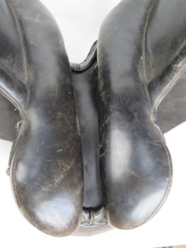 A black leather saddle by Berkeley inc stirrups, size 18 3/4".
