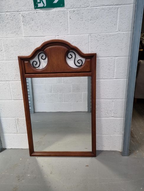 A contemporary wall mirror with 'ironwork' detail to top.