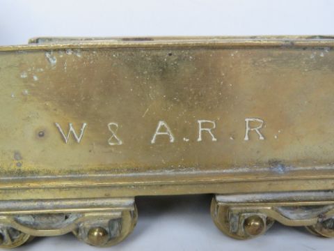 A large and heavy brass model train having articulated wheels marked for "Texas" "W&ARR" weighing 5.9kg.