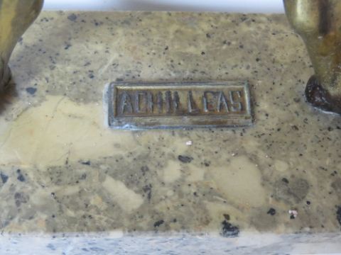 A gilt metal sculpture of Achilles raised over marble plinth, having raised shield and javelin to hand, standing 41.5cm high.