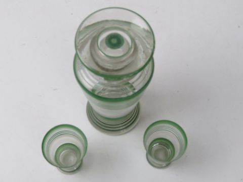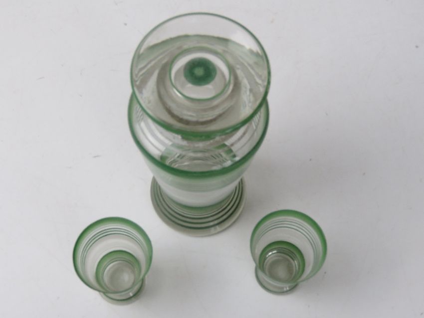 An Art Deco decanter with matching pair of tot cups, decanter standing 22.5cm high.