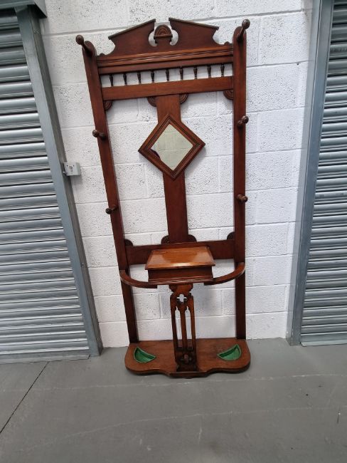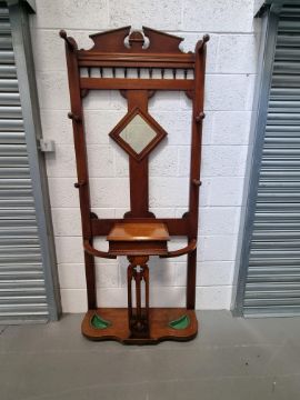 An Edwardian hall stand having central mirror and lidded compartment, twin umbrella stands with drip trays under.