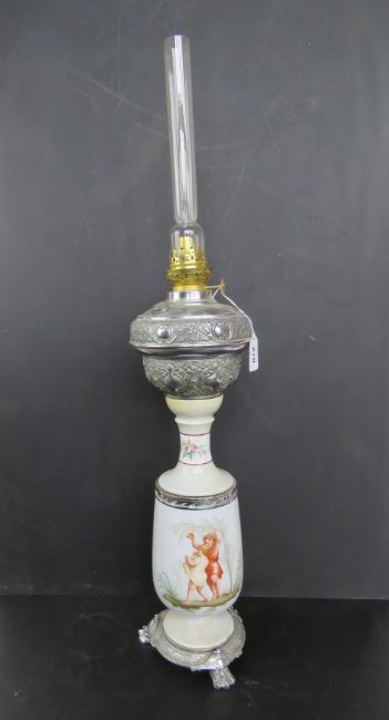 A large late 19th century French ceramic and chrome oil lamp with glass chimney having classical style cherubic children upon, all raised over lion's paw feet. Standing 80cm high.