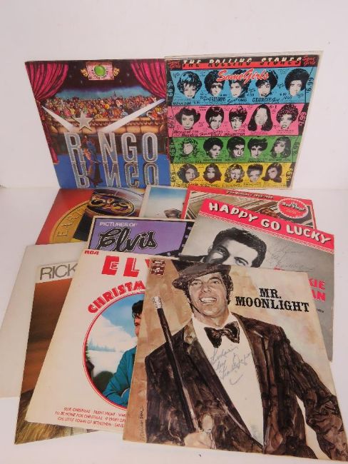 A collection of LP records including Rolling Stones Some Girls, Ringo Starr self-titled album, Elvis' Christmas album, The Beatles on red vinyl, Beatles White Album by Capital Records etc.