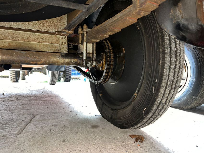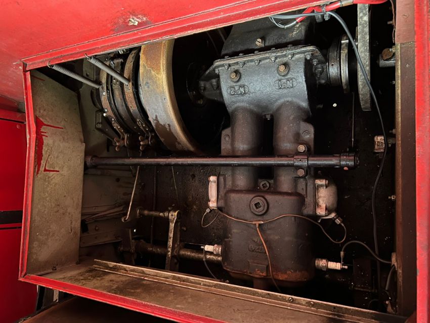 Red with Brooke Bond Tea livery, black leatherette bench seat.