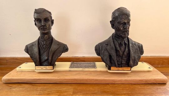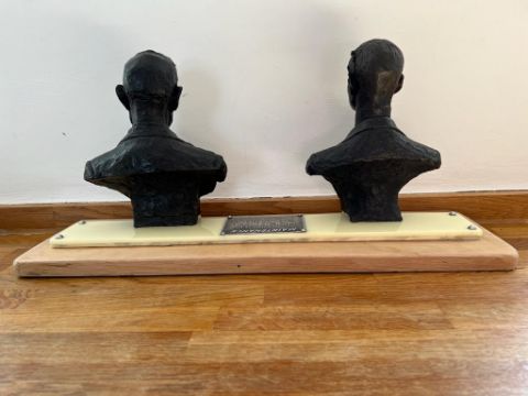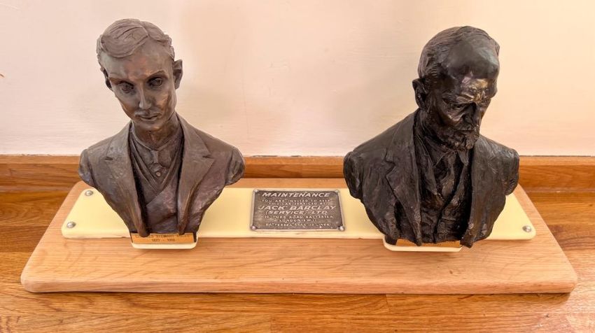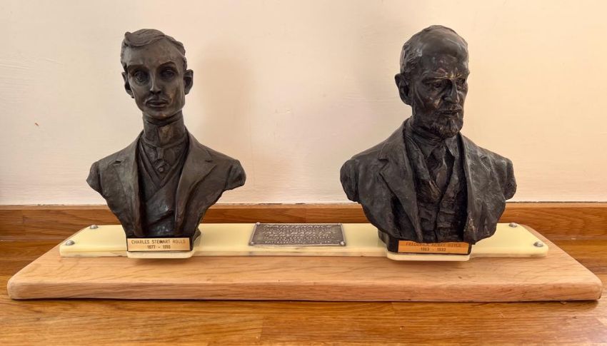 A fine automotive Rolls-Royce double-bust. Featuring Charles Stewart Rolls (1877-1910) and Frederick Henry Royce (1863-1933) each bearing an engraved brass name plate. The composite bronzed moulded busts each mounted on an Ivorex and hardwood plinth with a Jack Barclay (Service) Ltd invitational service plate upon. Weighing over 6kgs and measuring 55cm x 17 x 26. A fine homage to arguably one of the greatest names in automotive engineering.