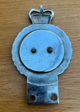 A Royal Army Medical Corps enamelled and chromium grill badge, bearing legend 'In Ardius Fidelis' upon (Faithful in Adversity) surmounted by crown. Measuring 13cm high. As made by Gaunt of London.