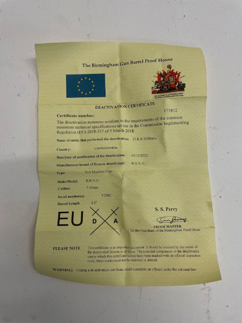 A deactivated (EU Cert) Skorpion sub machine gun with moving cocking handle under spring pressure, removable magazine and retractable stock. This lot will be available to collect in person 48 hours after the end of the sale. Please contact the office admin@humbertellis.com for collection appointments / postage quotes / courier information.