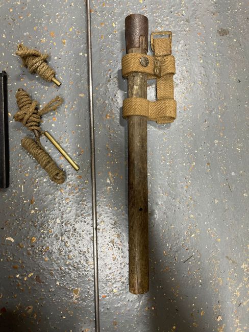 A quantity of assorted militaria inc, a WWII British entrenching tool handle with canvas holder, Bren/Vickers cleaning rod, Enfield rifle cleaning pull throughs, etc. This lot will be available to collect in person 48 hours after the end of the sale. Please contact the office admin@humbertellis.com for collection appointments / postage quotes / courier information.
