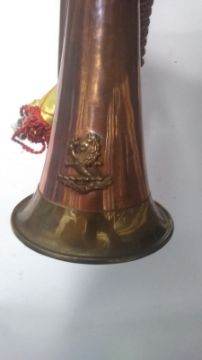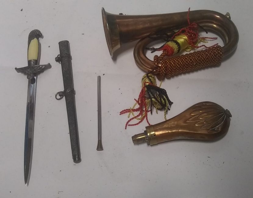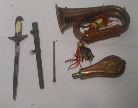 A quantity of militaria including dagger and scabbard, ram rod, powder flask and bugle. This lot will be available to collect in person 48 hours after the end of the sale. Please contact the office admin@humbertellis.com for collection appointments / postage quotes / courier information.