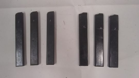 Three lacquered Sten magazines together with three Beretta M38 magazines. Italian Police markings to some of the Beretta magazines. This lot will be available to collect in person 48 hours after the end of the sale. Please contact the office admin@humbertellis.com for collection appointments / postage quotes / courier information.