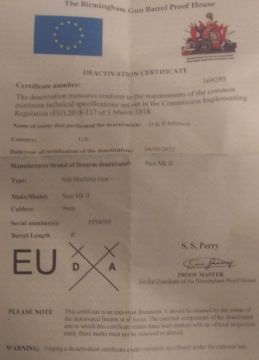 A deactivated (EU Spec) Sten Mk II submachine gun. This lot will be available to collect in person 48 hours after the end of the sale. Please contact the office admin@humbertellis.com for collection appointments / postage quotes / courier information.