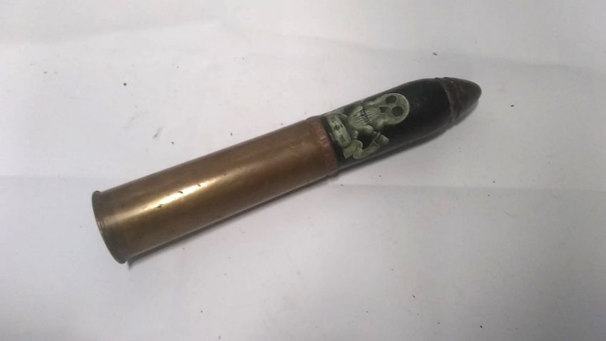 A WWI British 18pdr shell with skull themed trench art. This lot will be available to collect in person 48 hours after the end of the sale. Please contact the office admin@humbertellis.com for collection appointments / postage quotes / courier information.