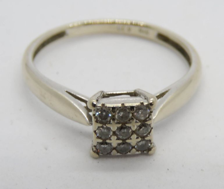 A 9ct white gold and diamond ring, the nine round cut stones set in a square head totalling 0.2ct, stamped 375, size N, 1.9g.
