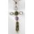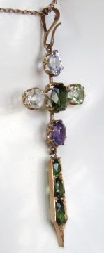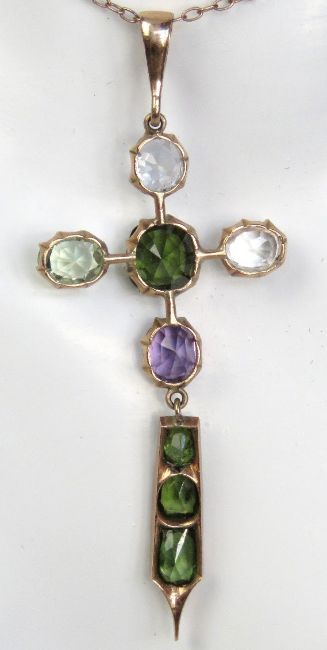 An impressive antique gem set crucifix on 9ct rose gold chain, the top of the cross having five claw set tourmaline (green, light green, white, purple and purple tint) the articulated lower section set with three further green tourmaline. The chain stamped 9ct no stamp to the pendant. Pendant measuring 6.6 x 2.6cm inc hook removable bale. Central stone 7.4 x 6.7 x 4.4mm (approx 1.5ct), cardinal point stones each measuring approx 6.5 x 5 x 3.5mm (each approx 0.8ct). Total weight 5.4g. In contemporary presentation box.