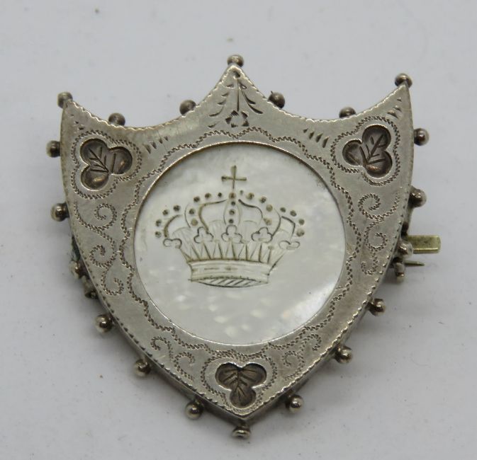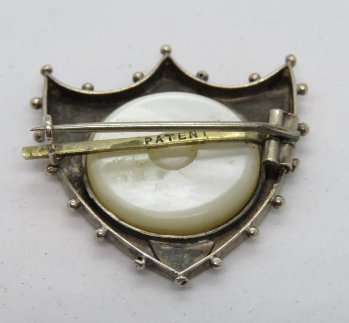 A hallmarked silver brooch in the form of a shield having central mother of pearl panel and clover design surrounding, HM for Birmingham.