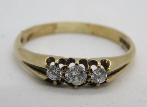 A 9ct gold ring having carved head set with three graduated round cut white cz stones, hallmarked 375, size N, 1.8g.