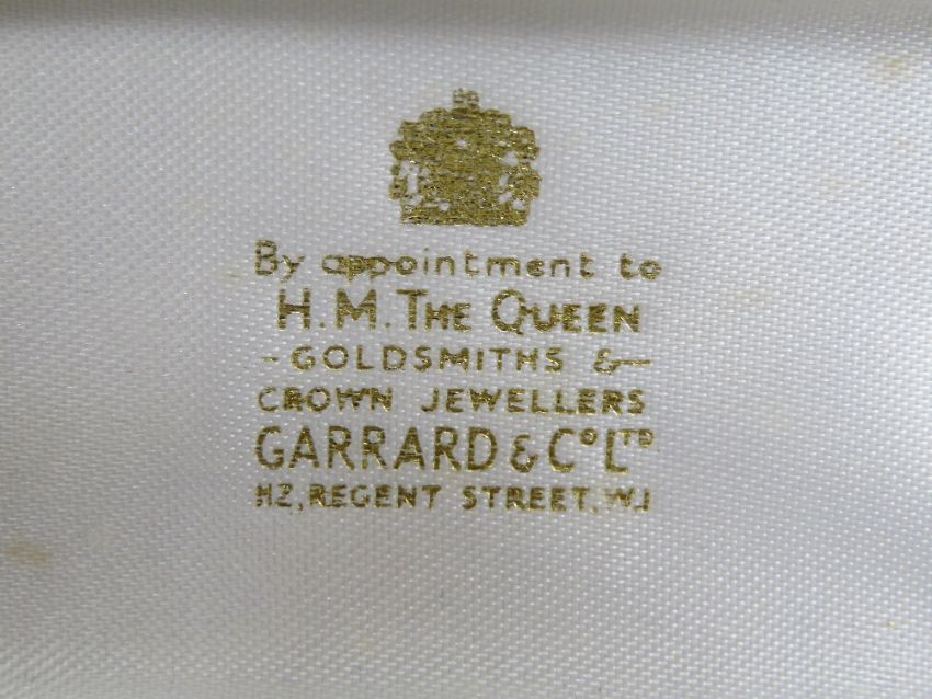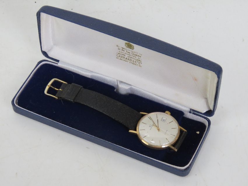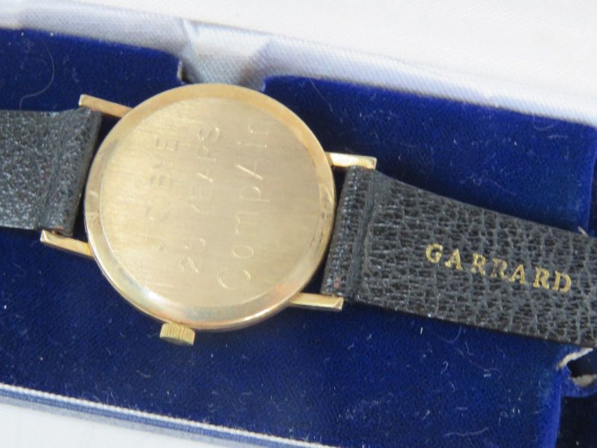 A 9ct gold Garrard wrist watch in original presentation box and on original Garrard strap, having silvered dial with date aperture, case back engraved.