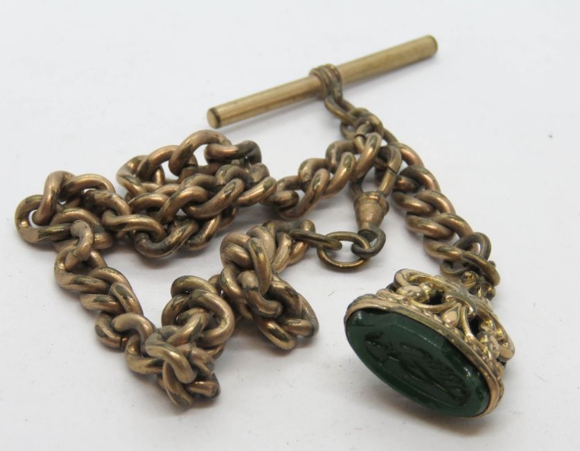 An antique seal having Classical female figure carved into the green stone, on watch chain with T-bar and dog clasp upon.