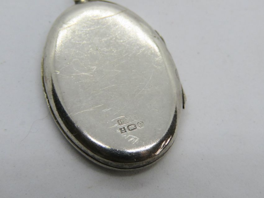 A hallmarked silver locket having part floral engraving to front, on white metal chain.