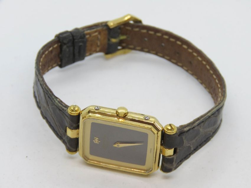 A ladies 18ct gold plated Raymond Weil wristwatch on original crocodile leather strap.