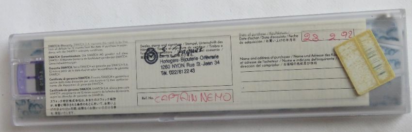 A Scuba 200 Swatch watch in Captain Nemo pattern, original packaging, new battery within box. Disclaimer: Please note watches are sold as untested and without guarantee.