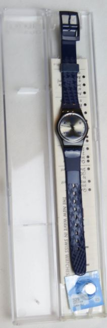 A Swatch watch in Mason pattern, original packaging, new battery within box. Disclaimer: Please note watches are sold as untested and without guarantee.