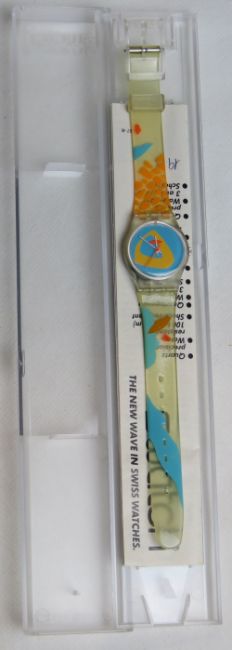 A Swatch watch in O Sole Mio pattern 1988, original packaging. Disclaimer: Please note watches are sold as untested and without guarantee.