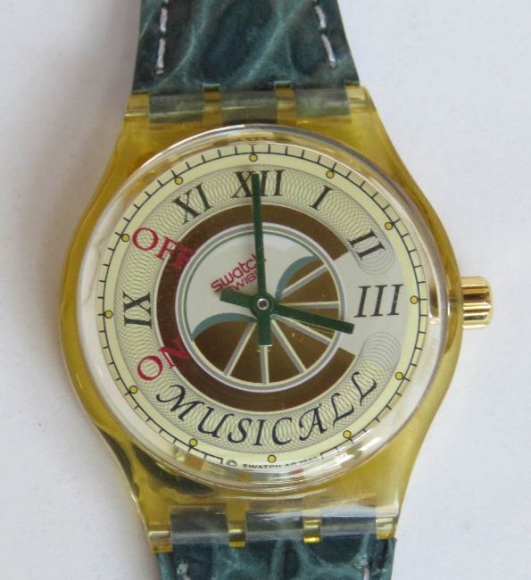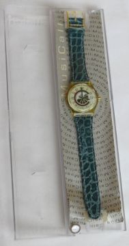 A Swatch Musical watch by J.M. Garre Green Gold Fagotto pattern, original packaging, new battery within box. Disclaimer: Please note watches are sold as untested and without guarantee.