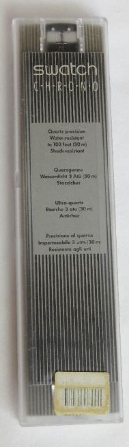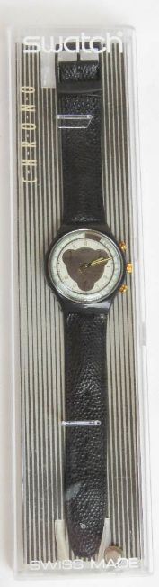 A Chrono Swatch watch in Colossal pattern, original packaging, new battery within bag. Disclaimer: Please note watches are sold as untested and without guarantee.