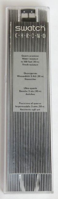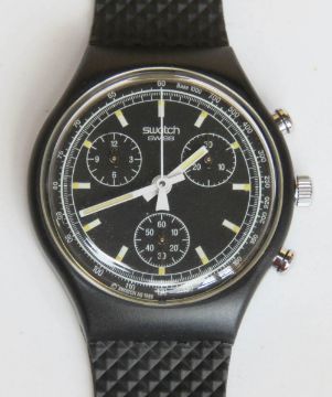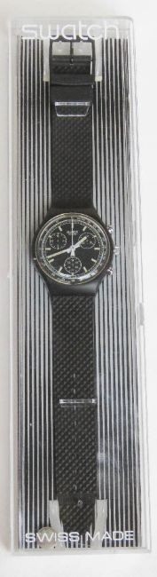 A Chrono Swatch watch in Black Friday pattern, original packaging, new battery within bag. Disclaimer: Please note watches are sold as untested and without guarantee.