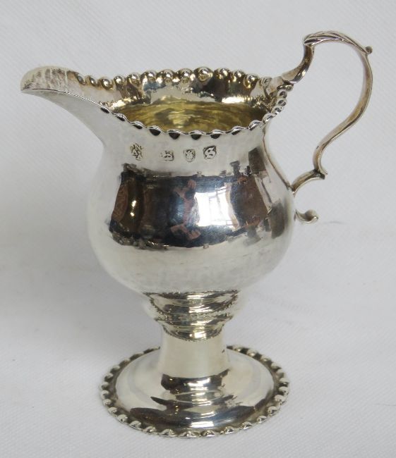 A George III hallmarked silver jug having beaded rim and foot, standing 10.5cm high, 85.5g / 2.75ozt. HM for London 1773.