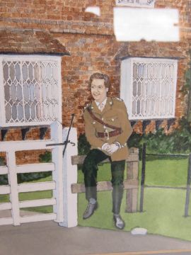 Original painting by unknown artist c1980s; country house with uniformed military officer, huntsman and lady stood to the foreground, framed.